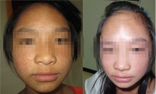病症:患者有3年病龄,现面部散布数量较多的褐色扁平状丘疹,诊断为处于中期的扁平疣,有进一步扩张的趋势。