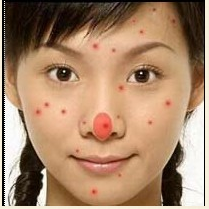 1.点状痤疮:黑头粉刺是痤疮的主要损害,是塞在毛囊皮脂腺口的乳酪状半固体,露在毛囊口的外端发黑,如加压挤之,可见头部呈黑色而体部呈黄白色半透明的脂栓排出。